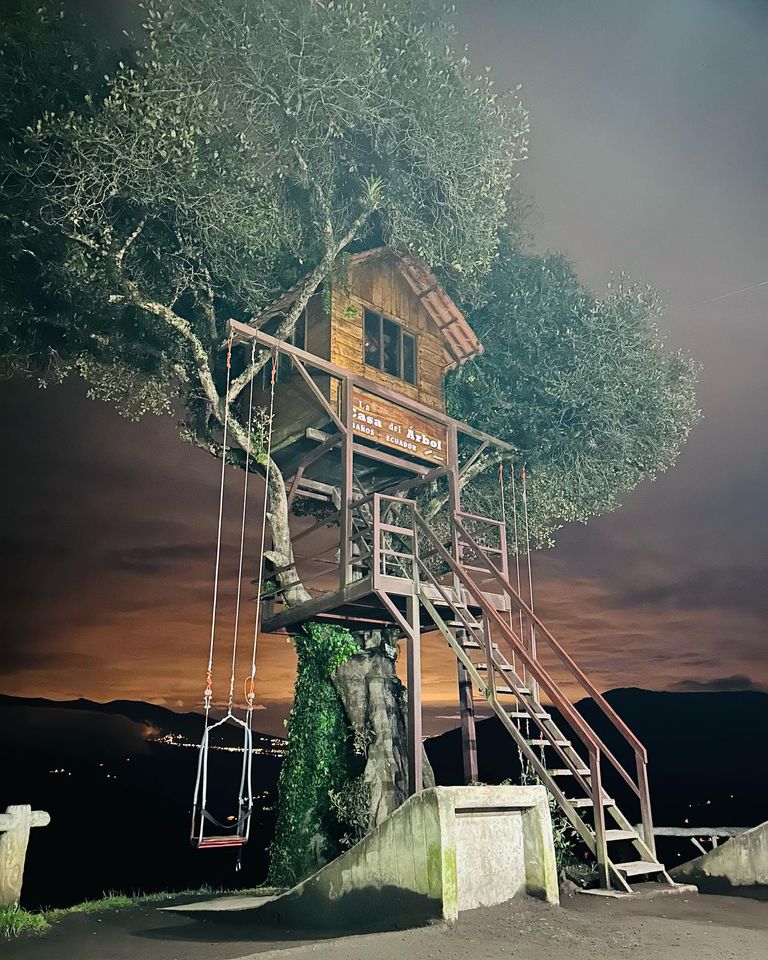 La Casa del Árbol es una pequeña estructura construida alrededor de un árbol en las montañas cerca de Baños. Ofrece a los visitantes una experiencia única al proporcionar columpios suspendidos sobre un abismo con impresionantes vistas del paisaje circundante, incluido el volcán Tungurahua.